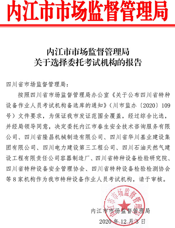 內江市市場(chǎng)監督管理關(guān)于選擇委托考試機構的報告
